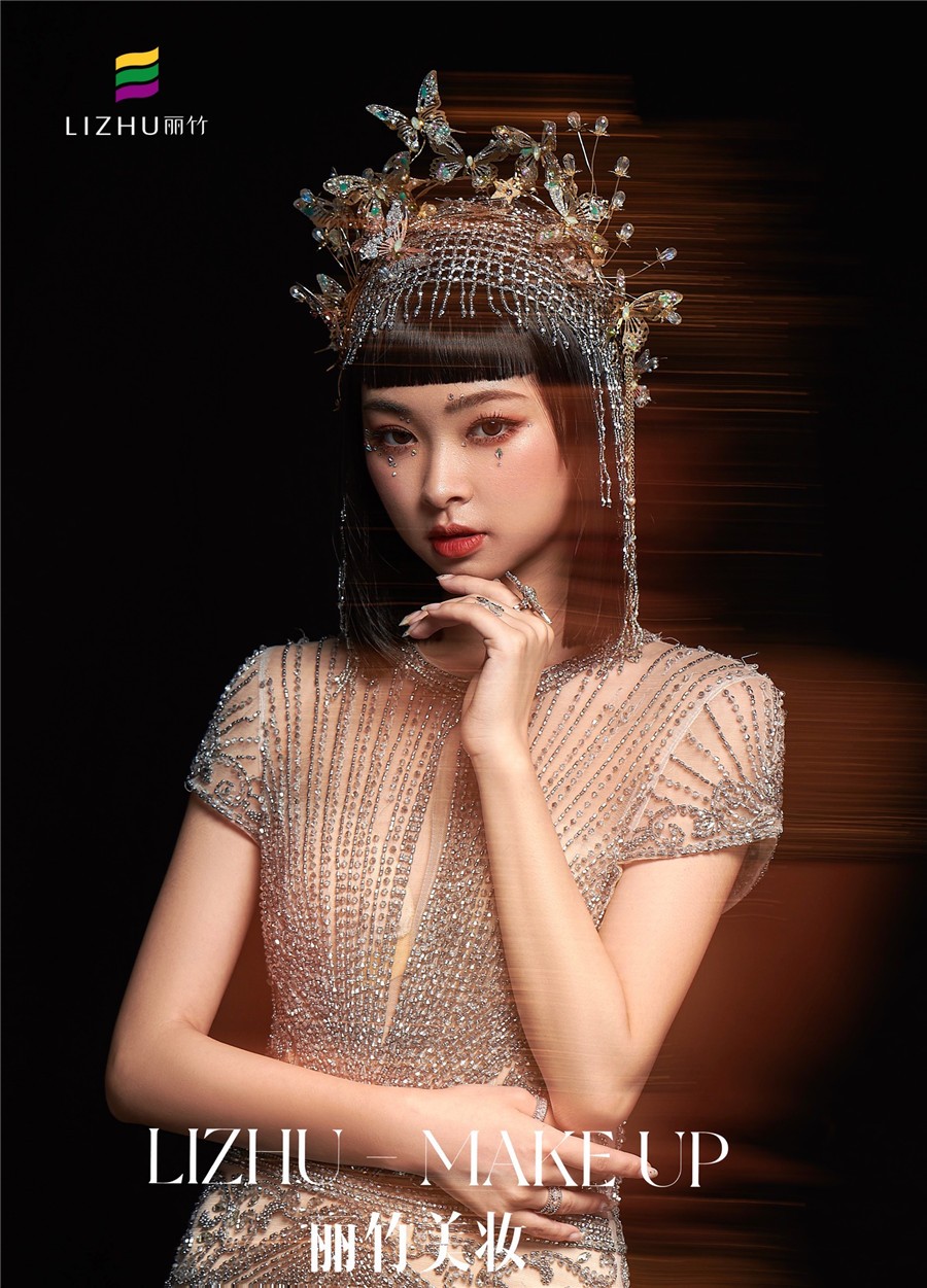 麗竹化妝學(xué)校作品---輕奢復(fù)古造型:奢華透視薄紗款禮服,勾勒出婀娜曼妙的身姿,頭飾與服飾滿鉆的鑲嵌,閃爍波光粼粼的神秘感,如夢如幻間與現(xiàn)實(shí)交替。
