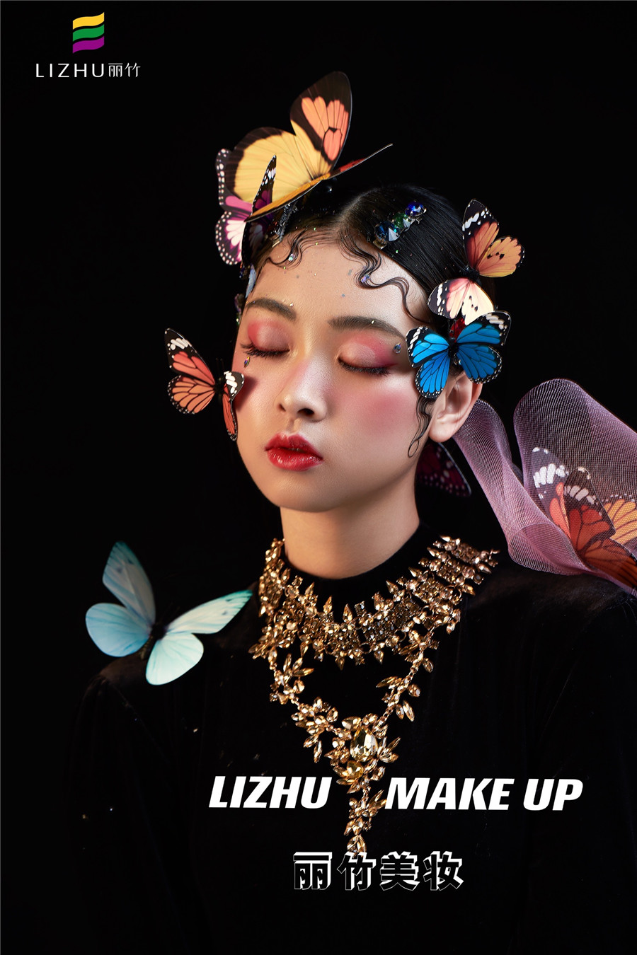 麗竹化妝學(xué)校作品---創(chuàng)意蝴蝶妝容:肩頭兩鬢和眼前額頭,被五彩斑斕的蝴蝶點(diǎn)綴,強(qiáng)烈的黑色背景搭配亮眼色差,產(chǎn)生了很強(qiáng)的視覺效果,讓人過目不忘之余,更寓意破繭成蝶涅槃重生的狀態(tài)。