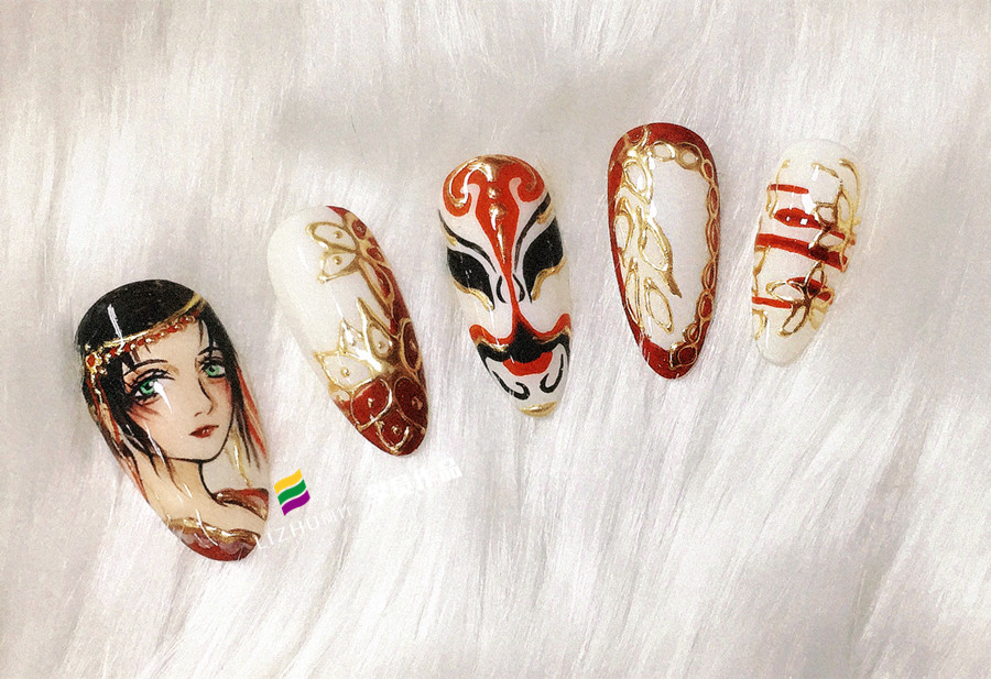 廣西美甲師培訓(xùn)班-彩繪卡通美甲:以金黃色和中國紅為主的色彩基調(diào),運(yùn)用細(xì)膩流暢的線條勾畫翩翩起舞的舞者,以及國粹臉譜形象,再加上金邊點(diǎn)綴的花朵,好一副歌舞升平的盛世景象。喜歡挑戰(zhàn)高難度繪畫的小可愛們,可以挑戰(zhàn)這款哦!