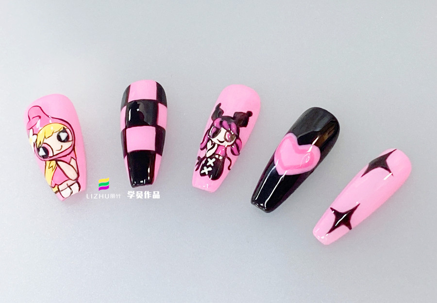 廣西美甲學(xué)校排行榜-彩繪卡通美甲:你想過,當(dāng)粉色和黑色相互碰面時(shí)能擦出怎樣的火花嗎?美甲的學(xué)員們就發(fā)揮自己的創(chuàng)意,將粉色奶瓶妹與黑色棋盤格及愛心等圖案進(jìn)行組合搭配,為我們繪制出了一款不一樣的可愛風(fēng)美甲。