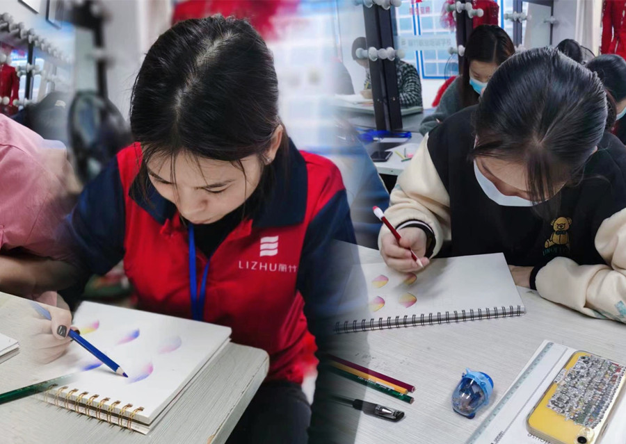 所以,在進行真人操作之前,南寧化妝基礎班(麗竹化妝基礎班)的學員現(xiàn)在就在玉老師的指導進行紙上眼影繪畫練習。還原整個眼皮、眼窩的形狀,學員們按照理論課上學習到的內容先進行輪廓大小繪畫,然后在使用棉簽,眼影刷等化妝工具蘸取眼影在紙上進行暈染,做到眼影的顏色層層遞進,自然通透就可以啦!