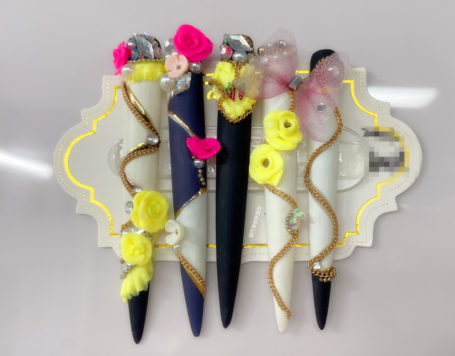 美甲師們在特別定制的長甲片上,通過采用彩繪,粘貼飾品,雕花,暈染等手法繪制出各種不同風(fēng)格的圖案。圖案的款式可以根據(jù)個人喜好而定,可以是彩繪水墨畫,輕奢復(fù)古的堆鉆款,也可以是充滿二次元的漫畫款……只要你喜歡,天馬行空任你畫。
