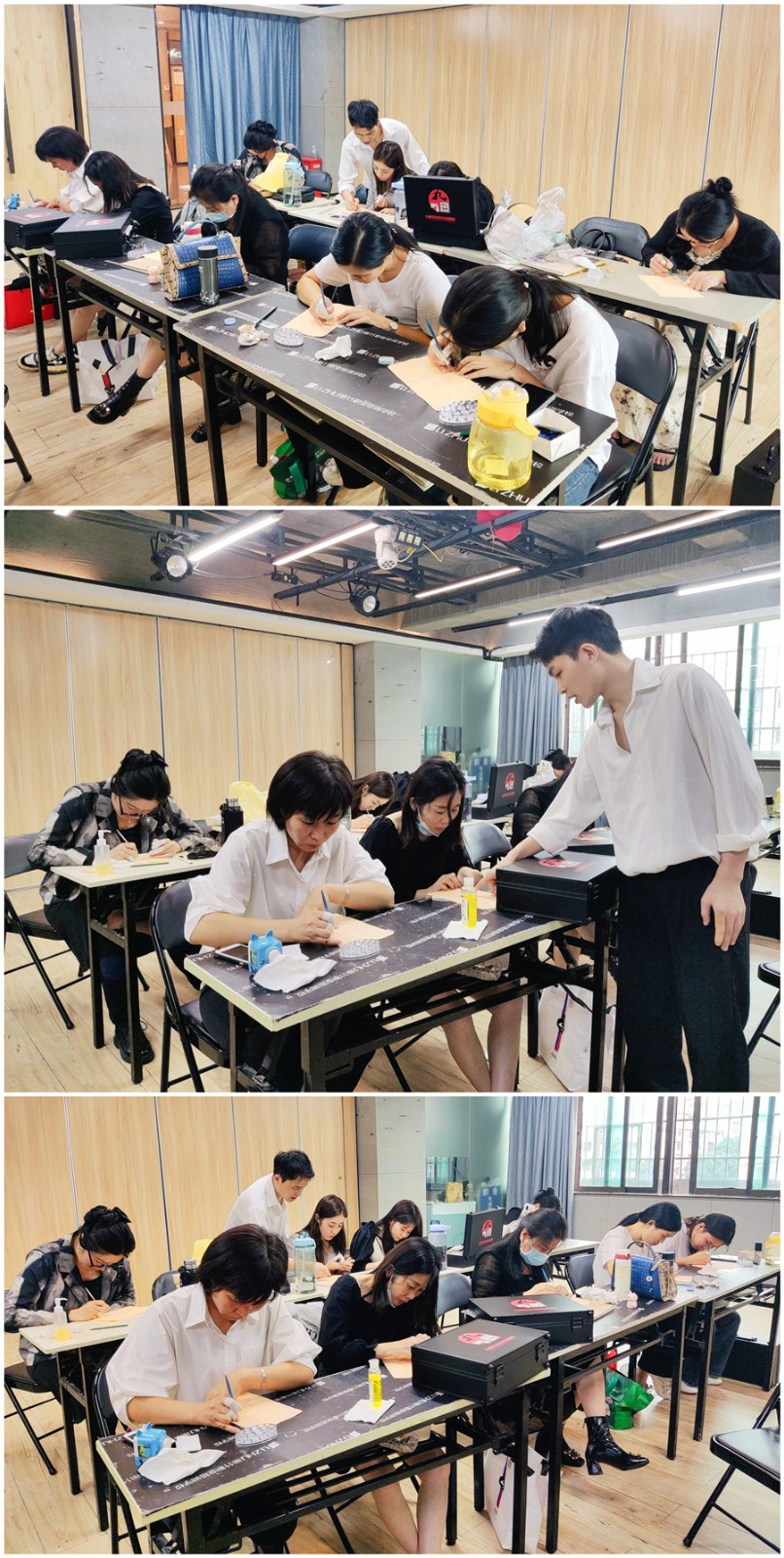 為期7天的《紋繡造型全能大師班》的課程已經(jīng)過半,同學們也在學習了色料的知識后,開始在仿皮上進行眉眼唇的填色練習,讓我們共同等待同學們進行真人實操的練習吧!