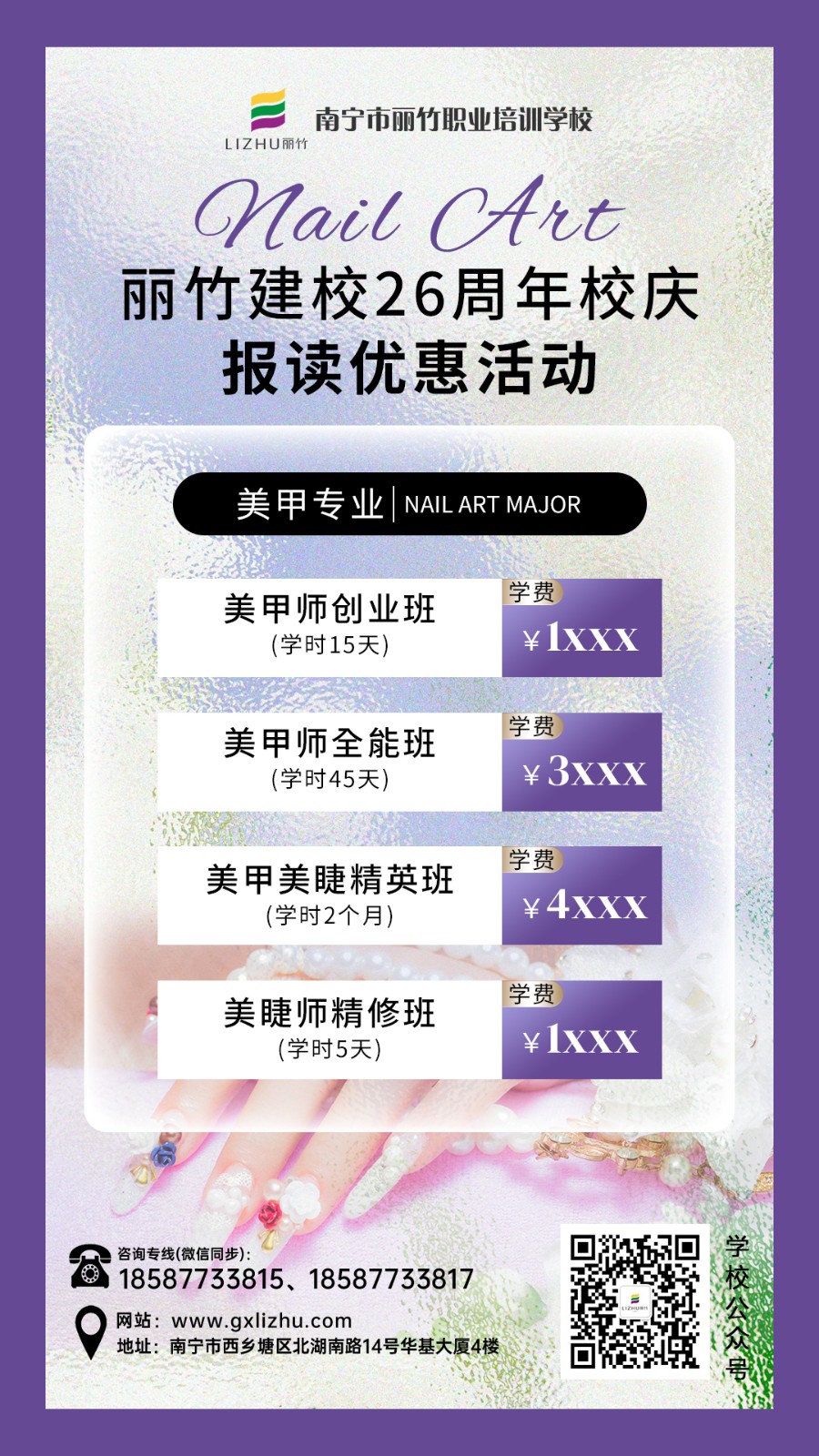 因此,如果你想在短時(shí)間內(nèi)學(xué)習(xí)一門(mén)專業(yè)技術(shù),那不妨考慮下美甲吧!更何況廣西老牌美業(yè)技術(shù)學(xué)校(麗竹學(xué)校)現(xiàn)在正在進(jìn)行招生優(yōu)惠活動(dòng),機(jī)不可失。