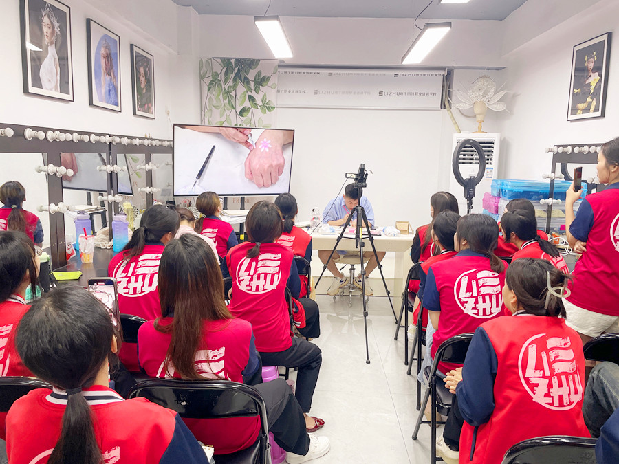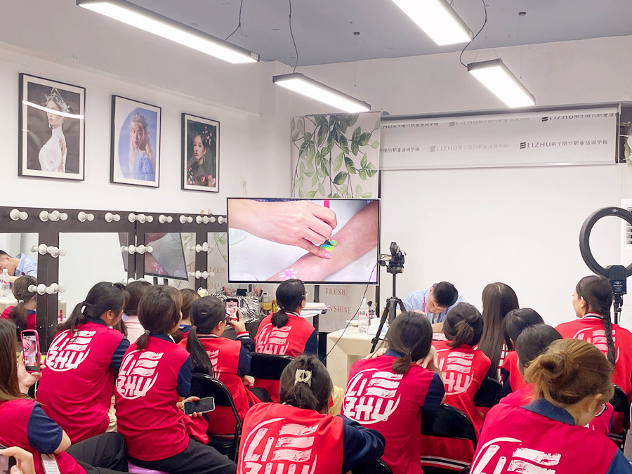 面部彩繪零基礎(chǔ)學(xué)習(xí)、廣西學(xué)面部彩繪:廣西彩妝化妝美妝造型學(xué)校(麗竹彩妝化妝造型學(xué)校)廣西彩妝造型進(jìn)修班的教室里,玉老師正在一邊給同學(xué)們講解廣西化妝面部彩繪教學(xué)里關(guān)于什么是面部彩繪的內(nèi)容,一邊通過在手上作畫演示彩繪的畫法。