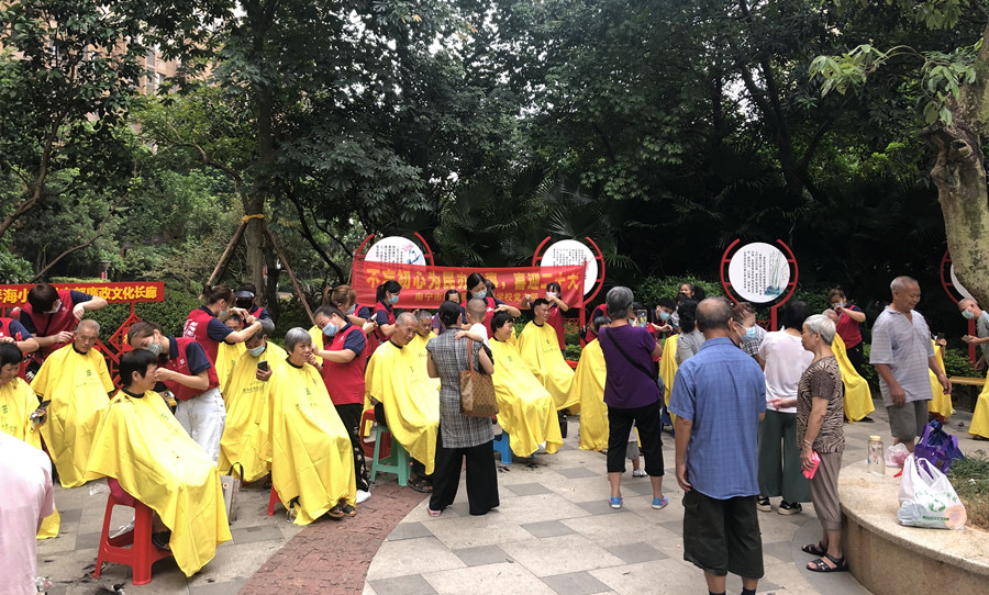 現場的學員們有序引導居民們坐在凳子上后,便快速將圍布圍起,詢問大家想要的發(fā)型。經過詳細簡短的交流后,學員們便開始熟練的開始為居民們理發(fā)。現場除了已經坐下理發(fā)的居民,還有很多居民繼續(xù)在現場等待理發(fā)。面對居民們的熱情,學員們也加快了手上的修剪動作。